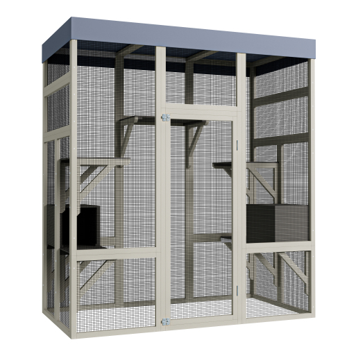 62.6" Outdoor Wooden Catio for Cats, Large Cat Enclosure with Waterproof Roof, 2 Cat Houses & Platforms, Secure Rust-Proof Wire Pet Cage for Patio or Backyard