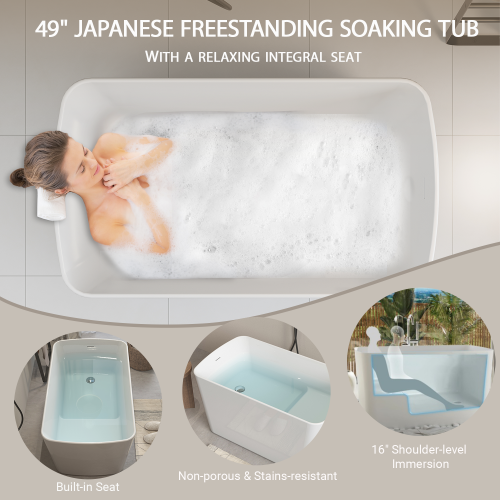 49'' Acrylic Freestanding Soaking Bathtub, Square-shape Japanese Soaking Hot Tub, Sit-In Design with Chrome Overflow and Drain for Express Delivery, Glossy White 23AMAZING-49 (W1920P179228)