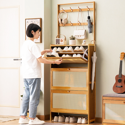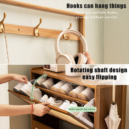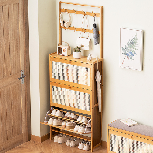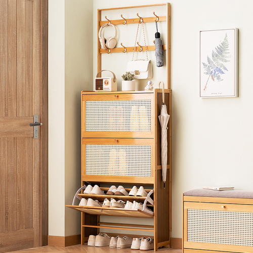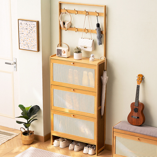 Product Name: Shoe Cabinet with 3 Rattan Flip Drawers, Bamboo Shoe Storage Cabinet with Coat Hooks, Freestanding Shoe Cabinet Storage for Entryway, Hallway, Closet, Living Room ( Natural Color )