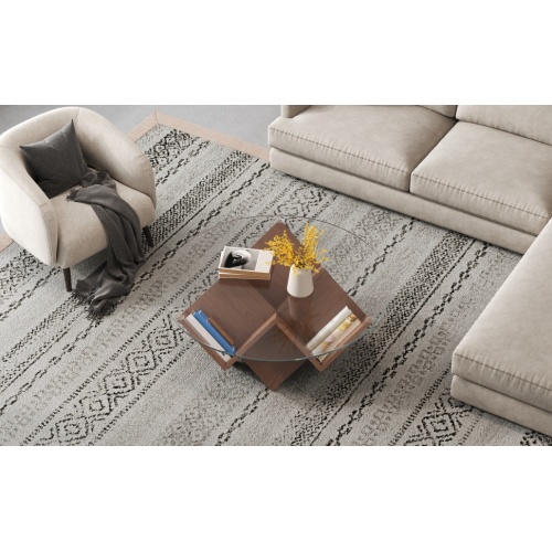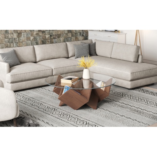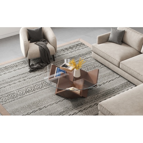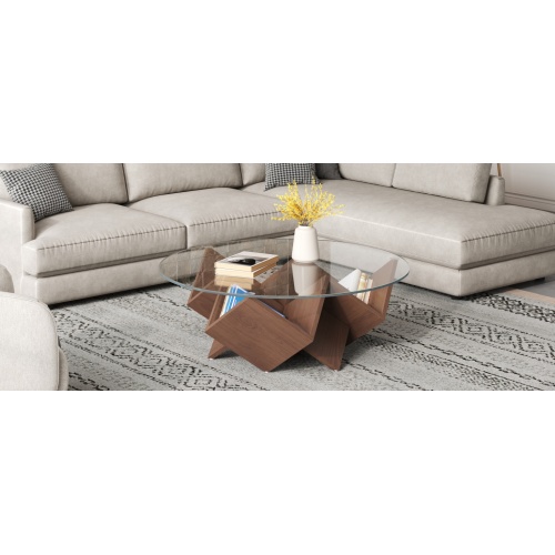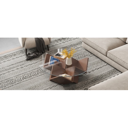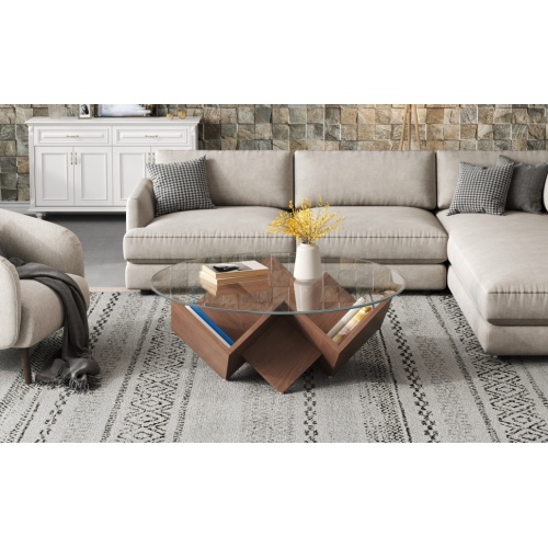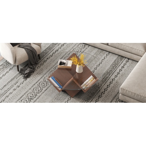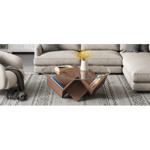 Product Name: The Round Coffee Table with Glass Top and Geometric Abstract Art Deco Base Storage Shelves, Walnut, 35.4"