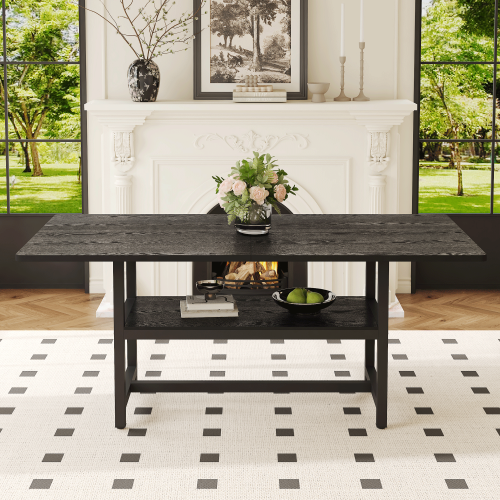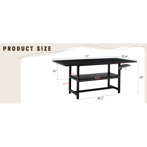 • 71 inch long fashionable walnut grain dining table, a practical choice to add color to the home.Making it perfect for both family gatherings and friend parties.Black Sprayed Metal Table Legs.
