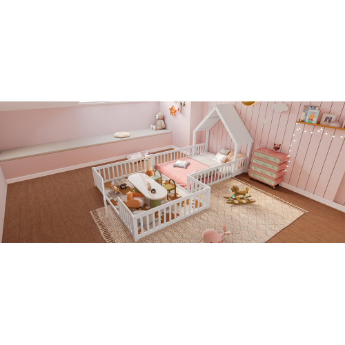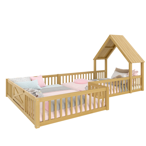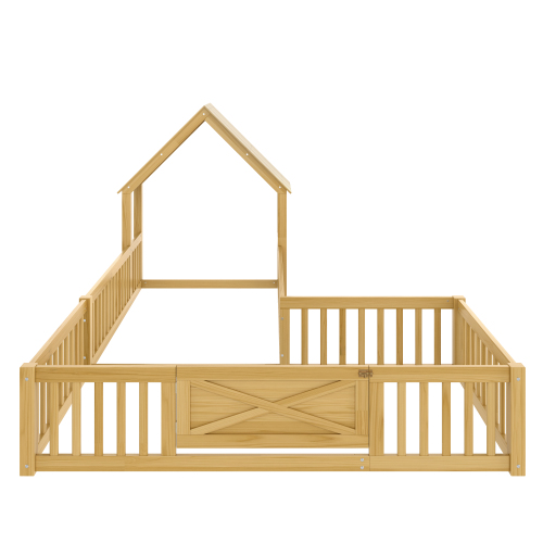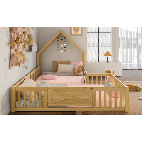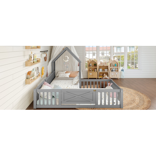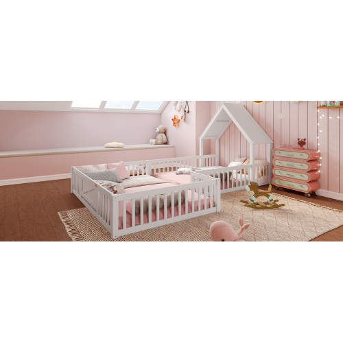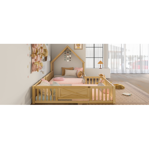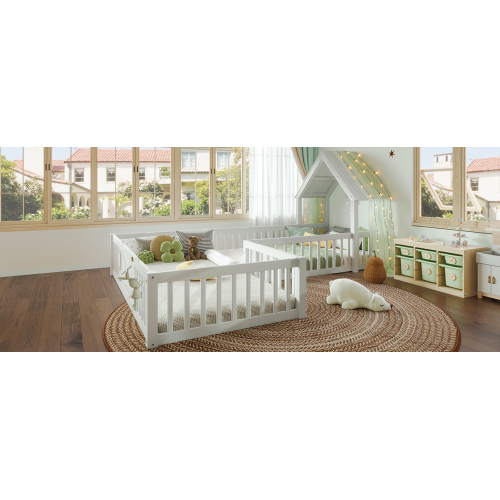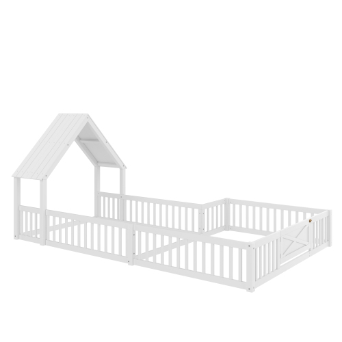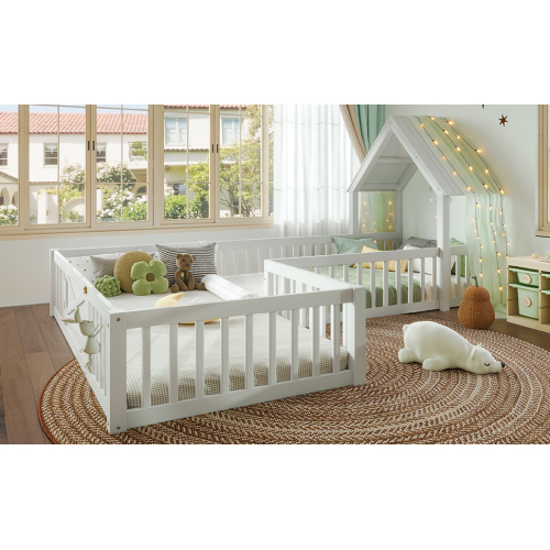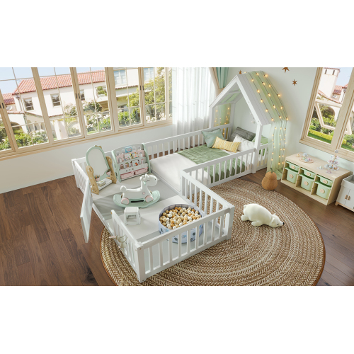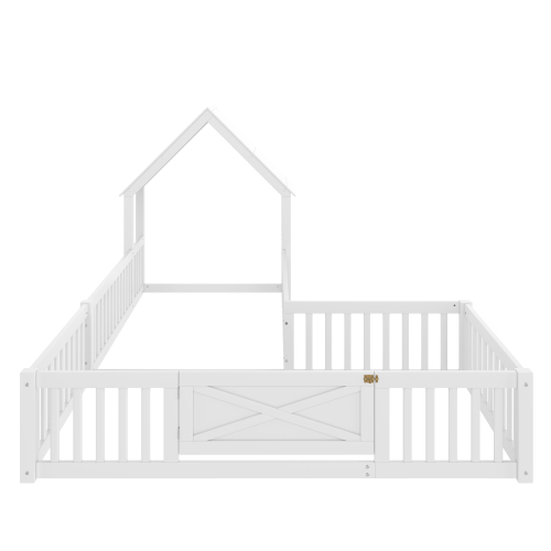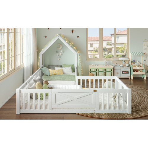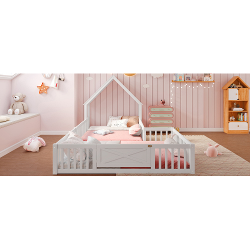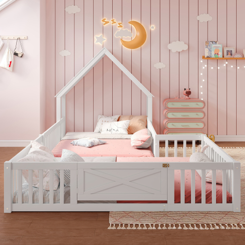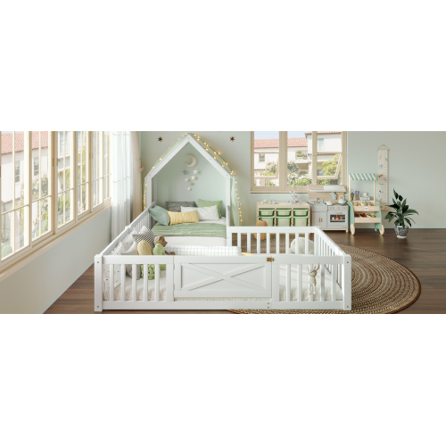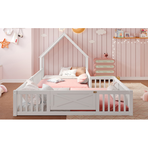 • Twin Size House Floor Bed, Double Twin Floor Bed with Door and Full-length Guardrails, Multi-function Design, White