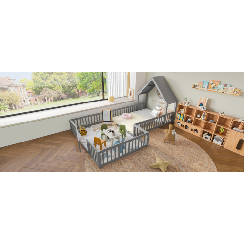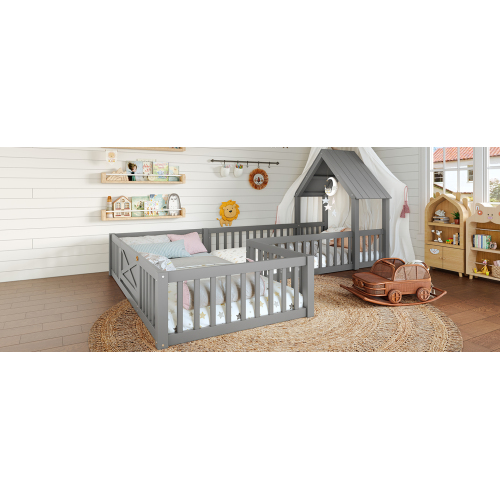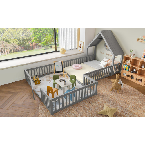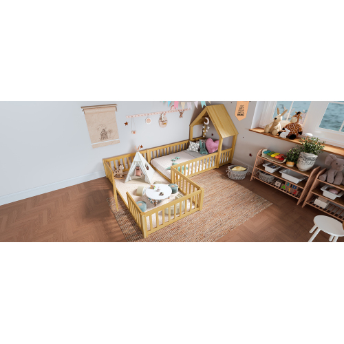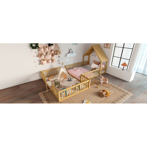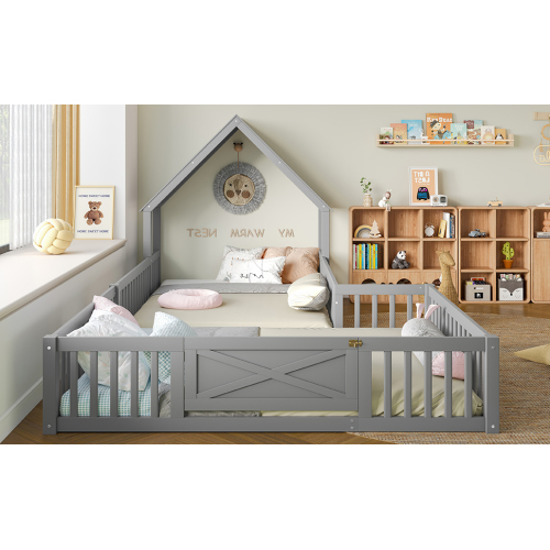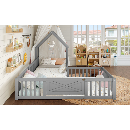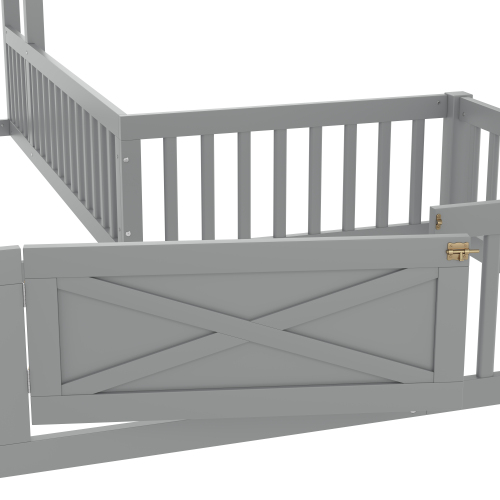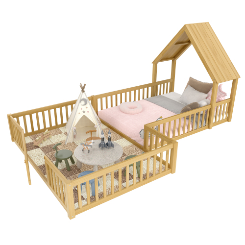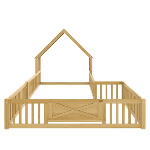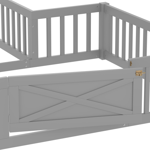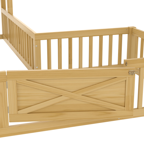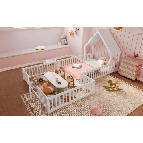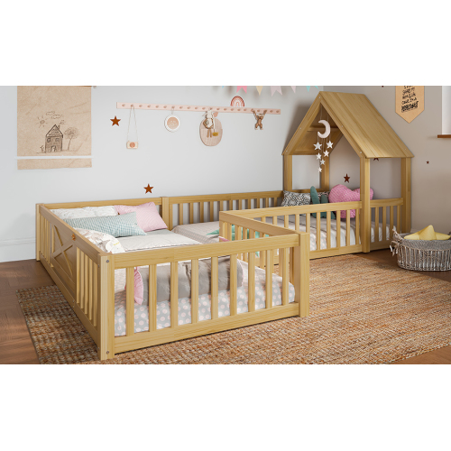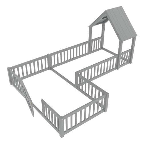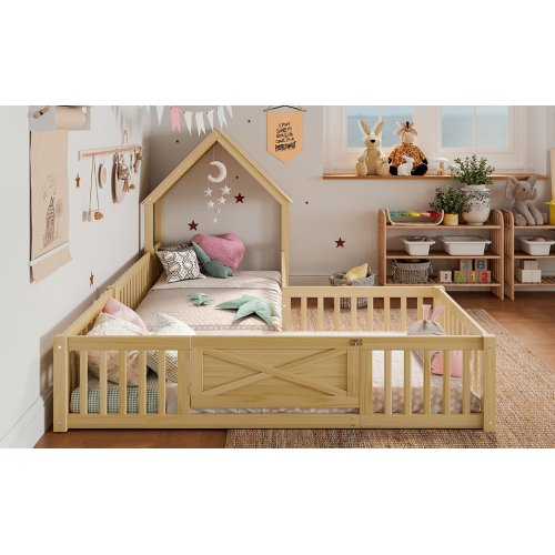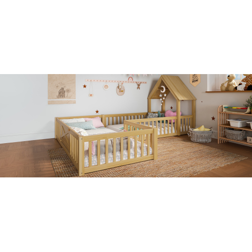 • Twin Size House Floor Bed, Double Twin Floor Bed with Door and Full-length Guardrails, Multi-function Design, White