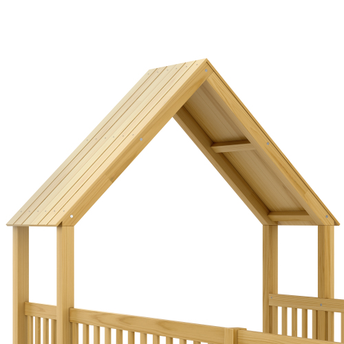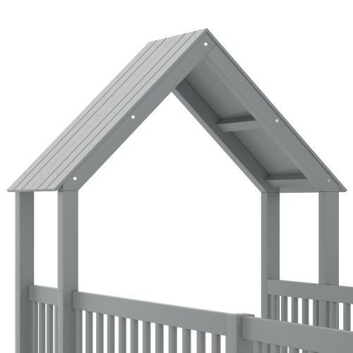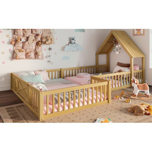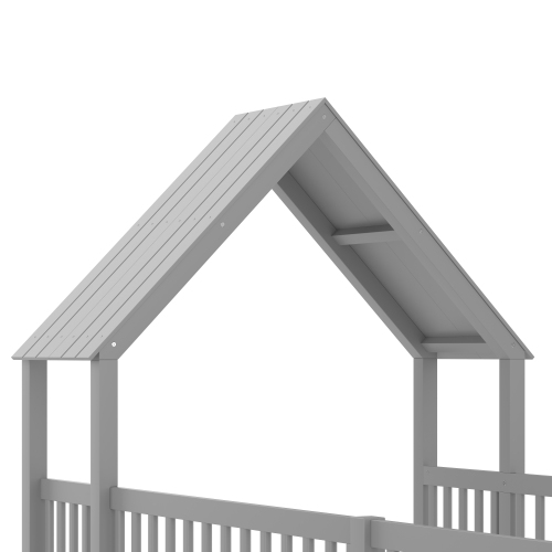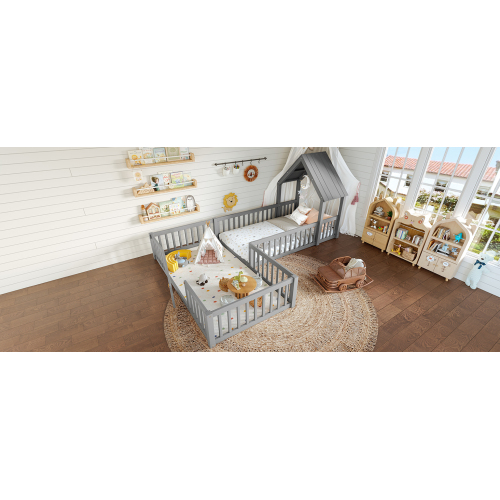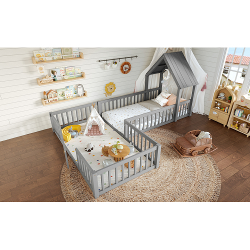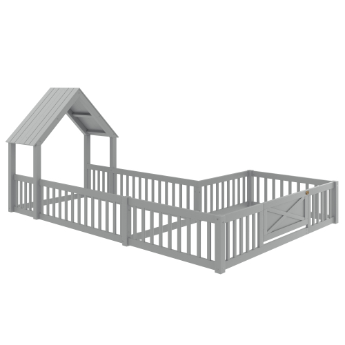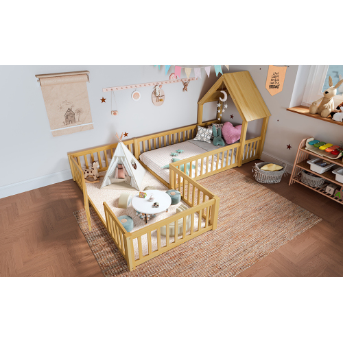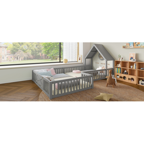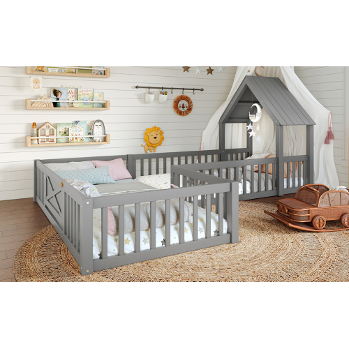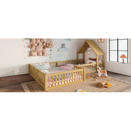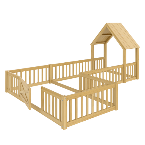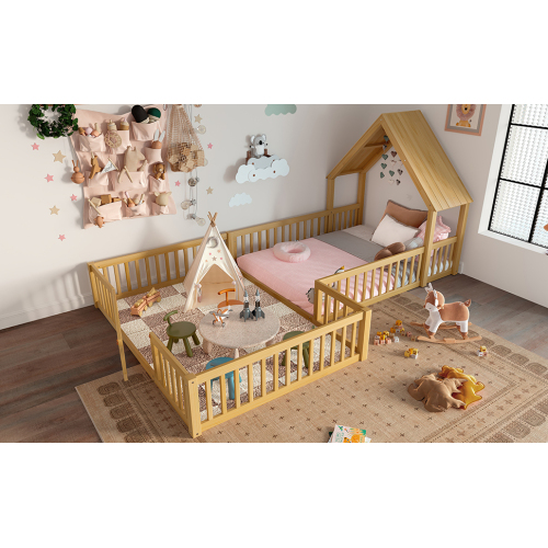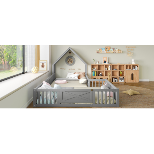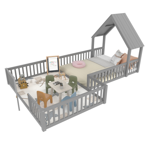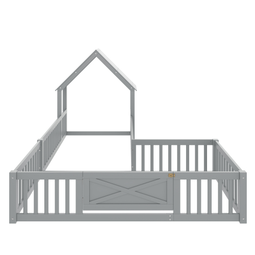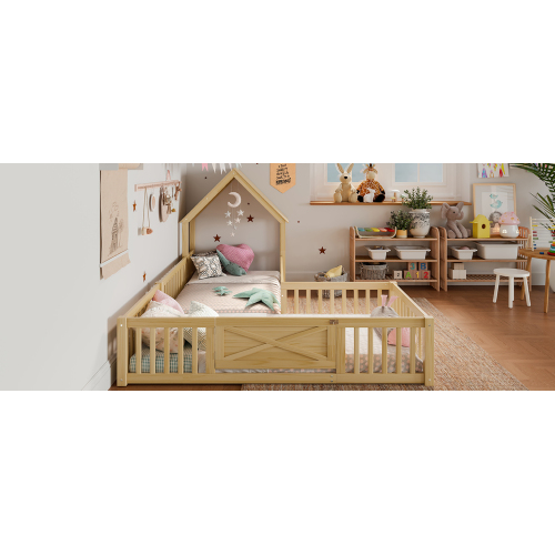 • Twin Size House Floor Bed, Double Twin Floor Bed with Door and Full-length Guardrails, Multi-function Design, White