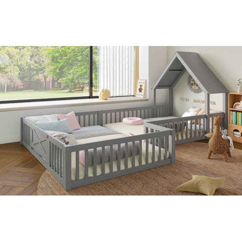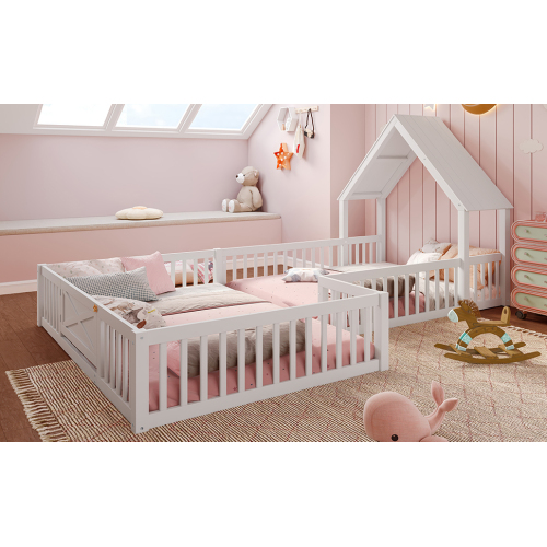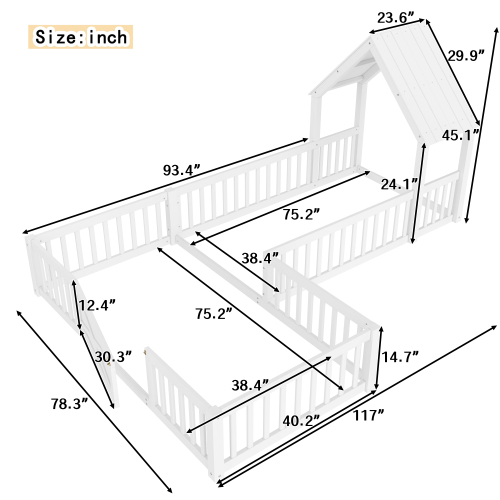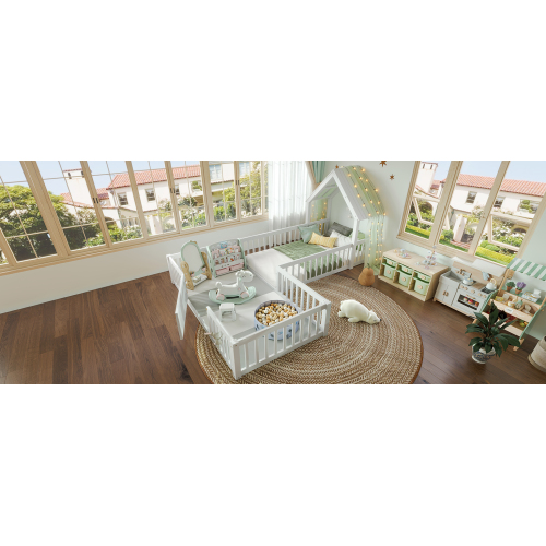 Product Name: Twin Size House Floor Bed, Double Twin Floor Bed with Door and Full-length Guardrails, Multi-function Design, White
