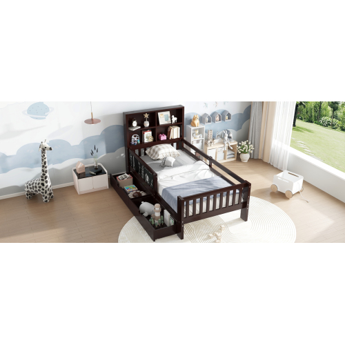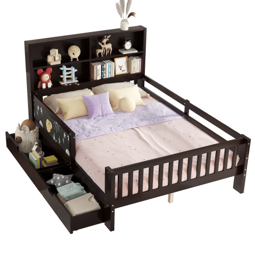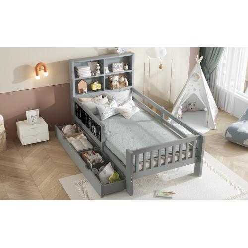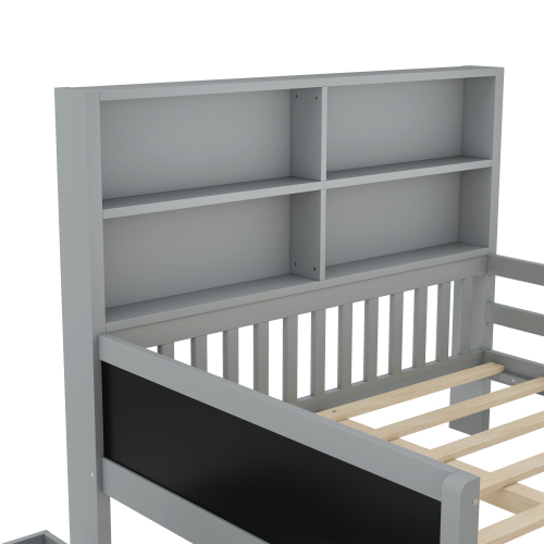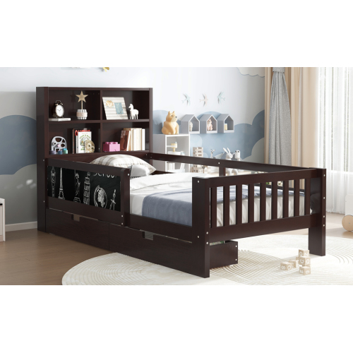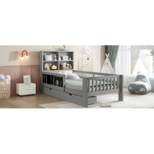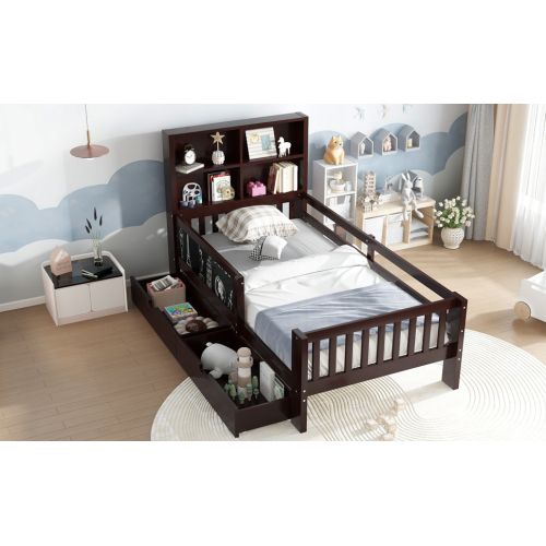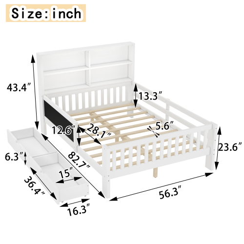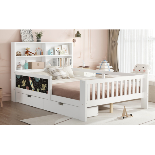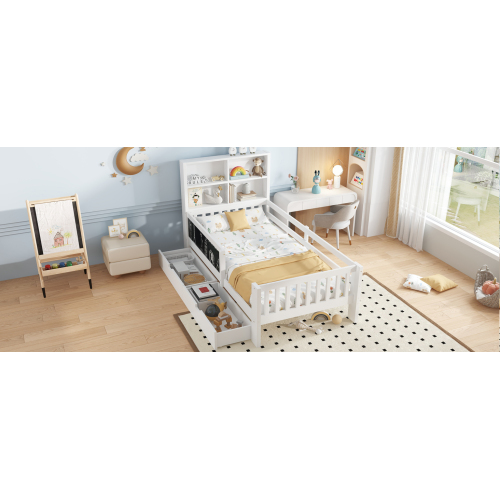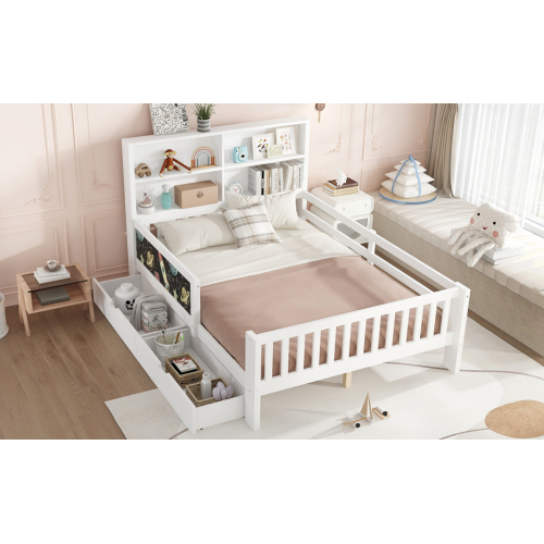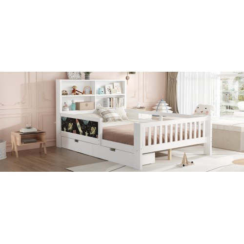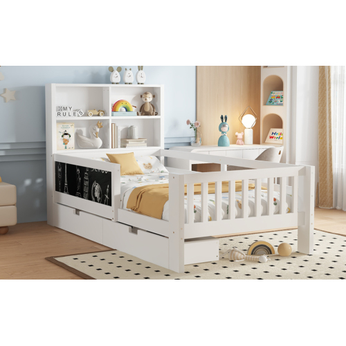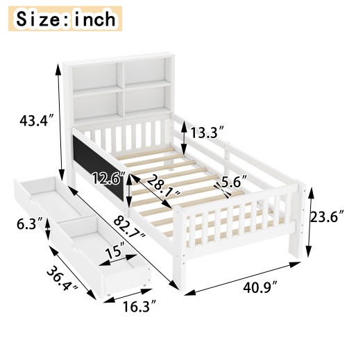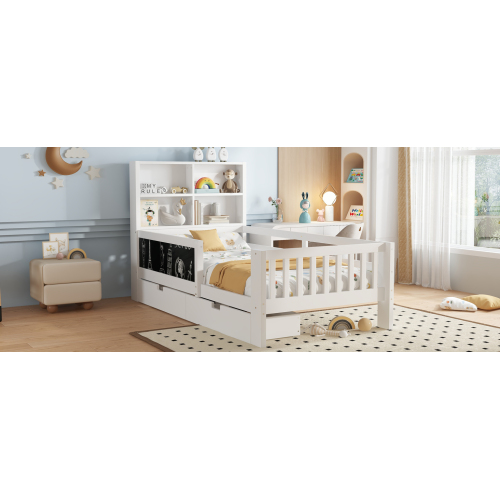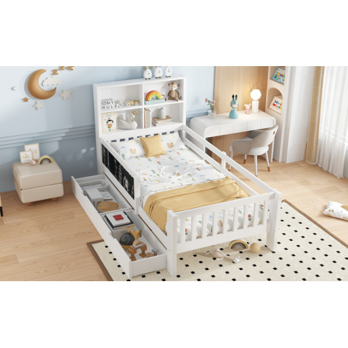 • Twin Platform Bed with Chalkboard,Solid Wood Platform Bed with Storage Drawers and Shelves,Childlike Fun and Space-saving Design,White